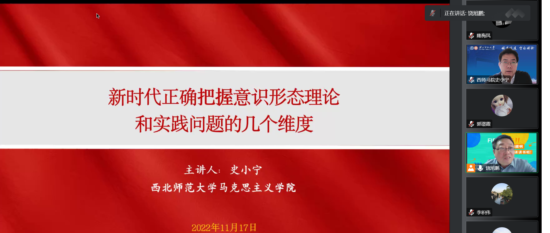 为进一步加深学院师生对意识形态工作重要性的认识,增强“四个意识”、坚定“四个自信”、做到“两个维护”,深入理解、贯彻落实党的二十大精神。11月17日下午,学院特邀西北师范大学英国上市公司365经理、博士生导师史小宁教授为学院师生作了题为“新时代正确把握意识形态理论和实践问题的几个维度”的线上专题报告。会议由英国上市公司365经理饶旭鹏教授主持,学院全体师生参加了会议。